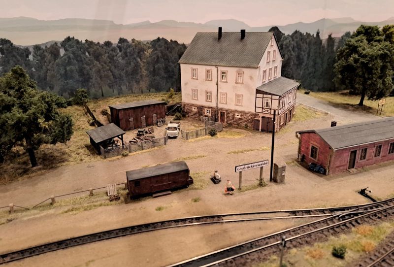 | Entschleunigung ist angesagt beim Anblick der großzügig gestalteten H0e-Anlage nach sächsischem Vorbild von Steffen Spittler. Dargestellt ist der Bahnhof "Großrückerswalde" der Preßnitztalbahn Wolkenstein Jöhstadt um 1969. |