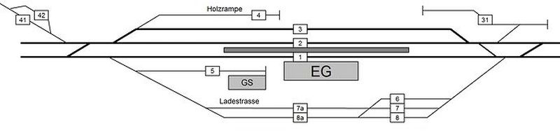 | Der Bahnhof "Walterburg" stellt einen in einem 180 Grad-Bogen liegenden Dorfbahnhof mit zwei Richtungsgleisen, einem in beiden Richtungen befahrbaren Ausweichgleis, mehreren Güteraufstellglesen sowie einigen Gütergleisen zu Güterschuppen, Rampe sowie einem Gleisanschluß dar. |