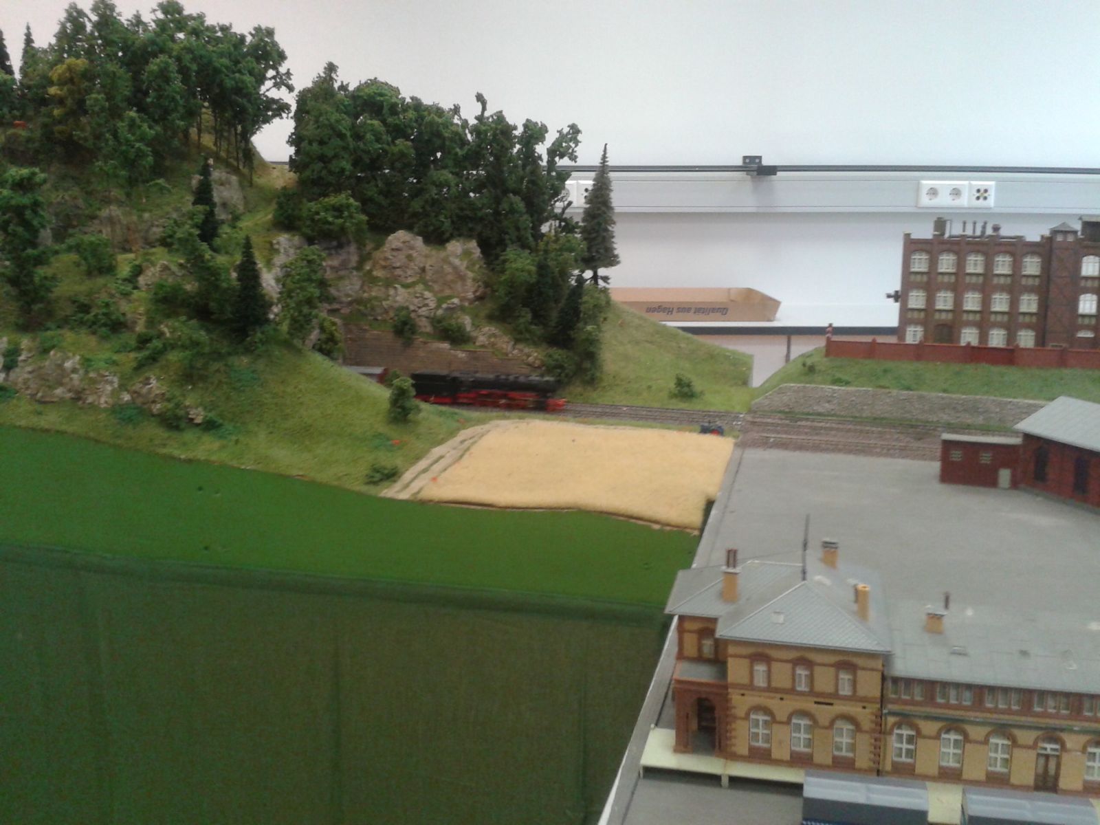 Übergang vom Bahnhof und dem Industriegebiet in der Landschaft. In der "großen" Version befinden sich dazwischen noch weitere Module mit landschaftlichen Motiven. (November 2016) |