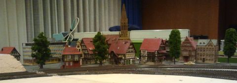 Altstadt mit Kirche. Hier verläuft jetzt die Rampe zur Fabrik. (Idsteiner Modellbahntage 2015) |