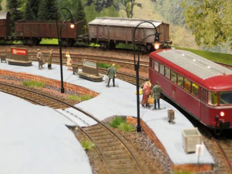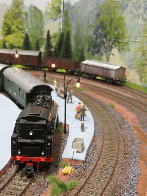 | Rocrail | | Kleine Anlage gesteuert durch Rocrail über PC, Handy und Tablet. Alles komponenten sind über Wlan an einen Router angebunden der via Lan das Signal an die Roco Zentrale z21 weiter gibt. Decoder für die Magnetartikelsteuerung und die Decoder von den Fahrzeugen sind Wild gemischt, gefahren werden kann fast alles. | | Gebaut wird bekannterweise in Modulbauweise, zusammengeschraubt ist die Anlage auf 1*0,4*0,8 in einer Ecke zu verstauen, also wirklich klein. | | In naher Zukunft ist der vollautomatische Betrieb vorgesehen, dann koennen bis zu 3 Fahrzeugbewegungen - mit der H0e Strecke sogar 4 - durchgeführt zu werden. | | Also auf wenig Platz viel los. |